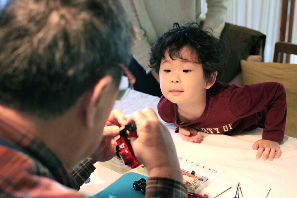 普段見ることのないおもちゃの構造に興味津々なお父さんや、うしろ脚が動かなくなってしまったねこちゃんをハラハラしながら見つめる女の子。