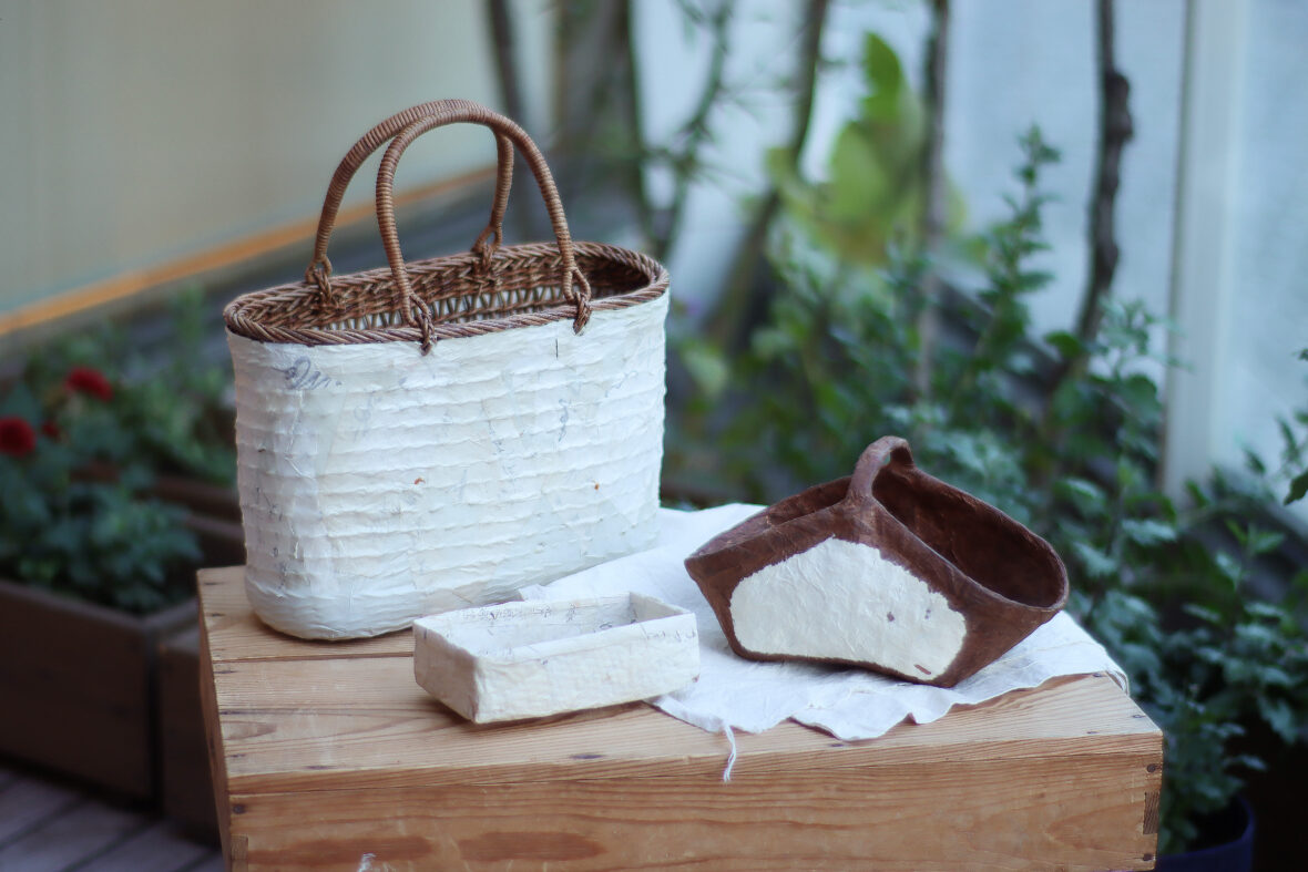 一閑張りとは、籠や陶器、木製品に和紙を貼り重ね、柿渋や漆で仕上げる日本の伝統工芸です。一閑張りは籠や木製品を強化し、耐久性・耐水性・抗菌性を高めます。この技法は、壊れた籠を修理したり陶器の表面を補強したりする実用的な道具として、一般家庭で使われてきました。