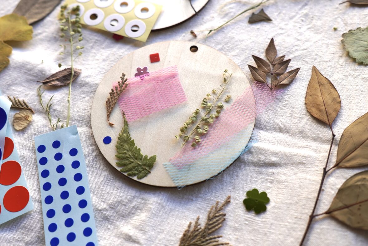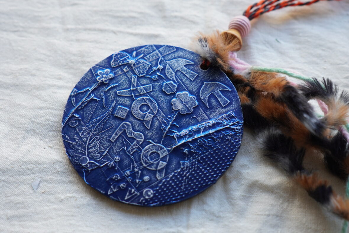 葉っぱやあみあみ、シールの切れはしなど…。身の回りのデコボコを探しながら台座に貼ってデコボコを作ります。メタル箔のシートを貼り付けて磨いていくと、金属のような質感が現れます。ヒモを通してつけて毛糸やビーズを付けて、ゴージャスな自分だけのメダルネックレスを作ります。