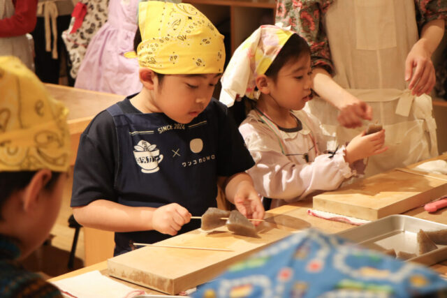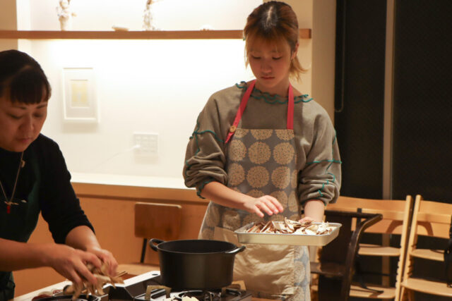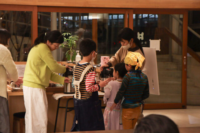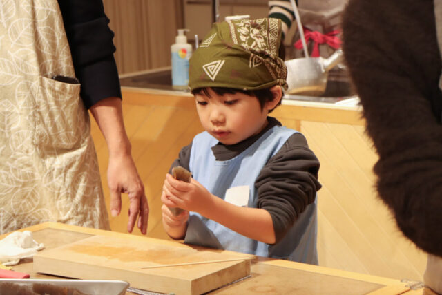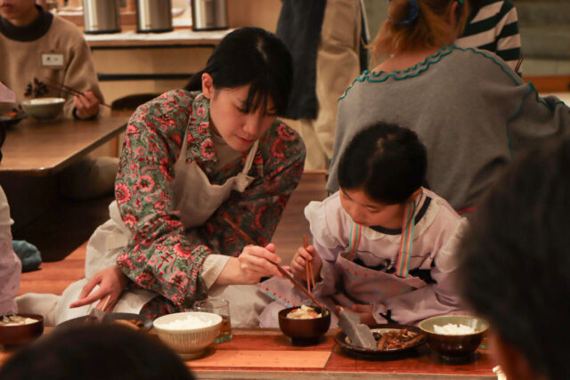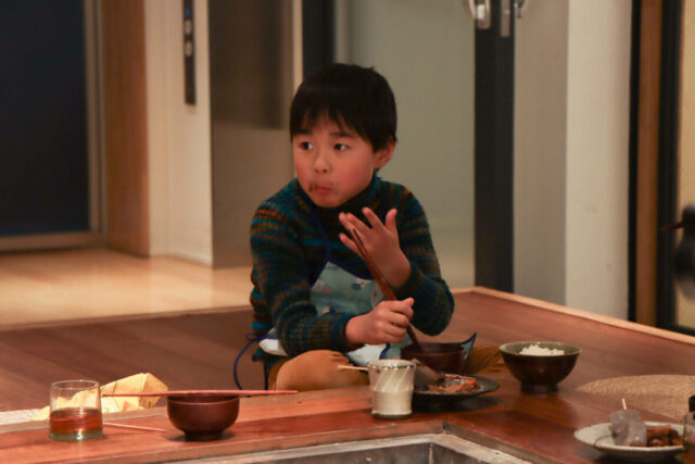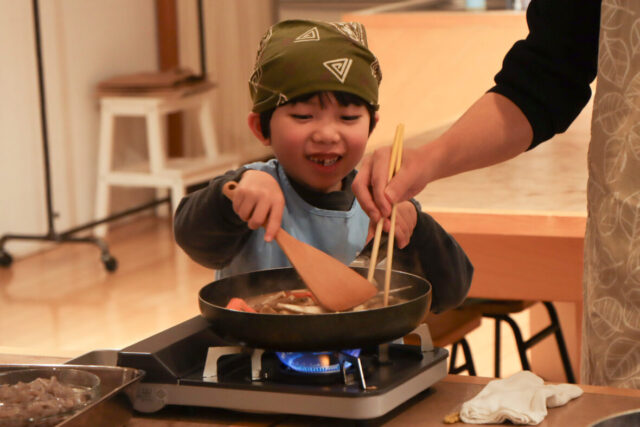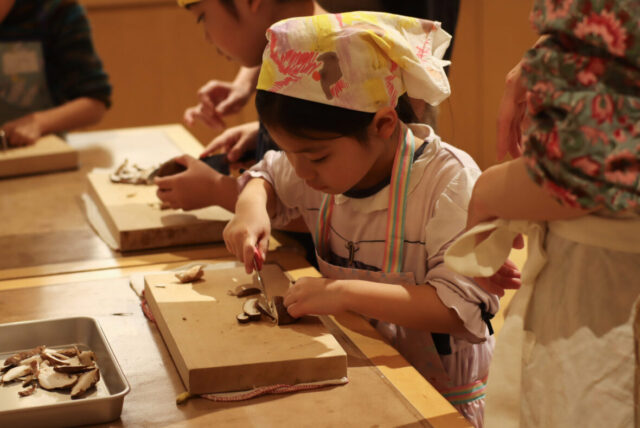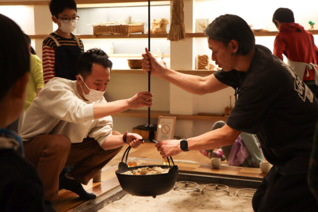続いて煮炊きの工程へ。おっきりこみの、具だくさんのおいしそうな見た目と、なんともいえないいい匂いに、こどもたちから「おなかすいた!」「早く食べたい!」の声があがります。