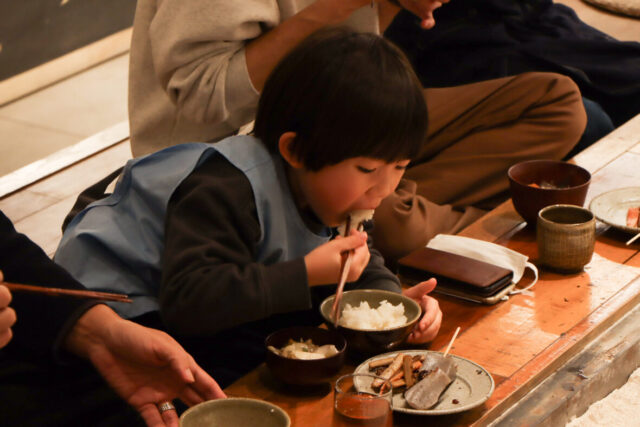 かまど飯もつやつやに炊きあがり、食卓をみんなで囲んで「いただきます」。