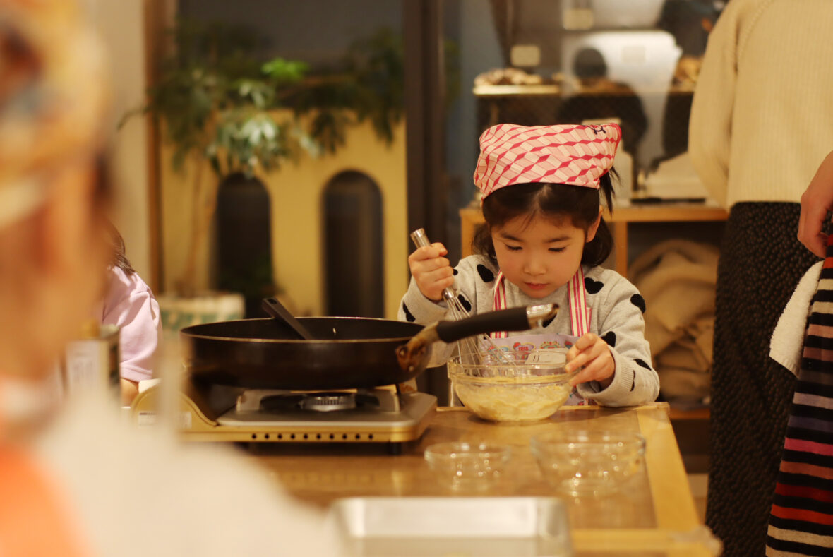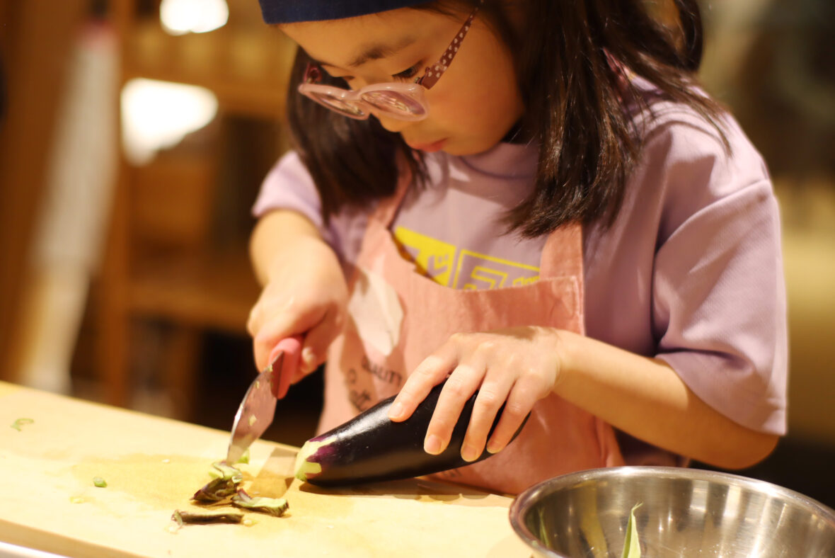 こどもたちは今日も大忙し。こねり用の茄子とピーマンをそれぞれ輪切りと千切りにし、いりこと一緒にフライパンで炒めます。はねる油にドキドキしながら炒め終えたら、味噌、砂糖、小麦粉をしっかり水で溶いてから味付け。粉に火が入って少しずつとろみがついてくると「早く食べたい!」の声が続出しました。