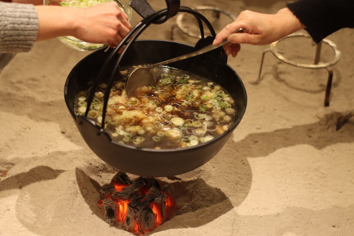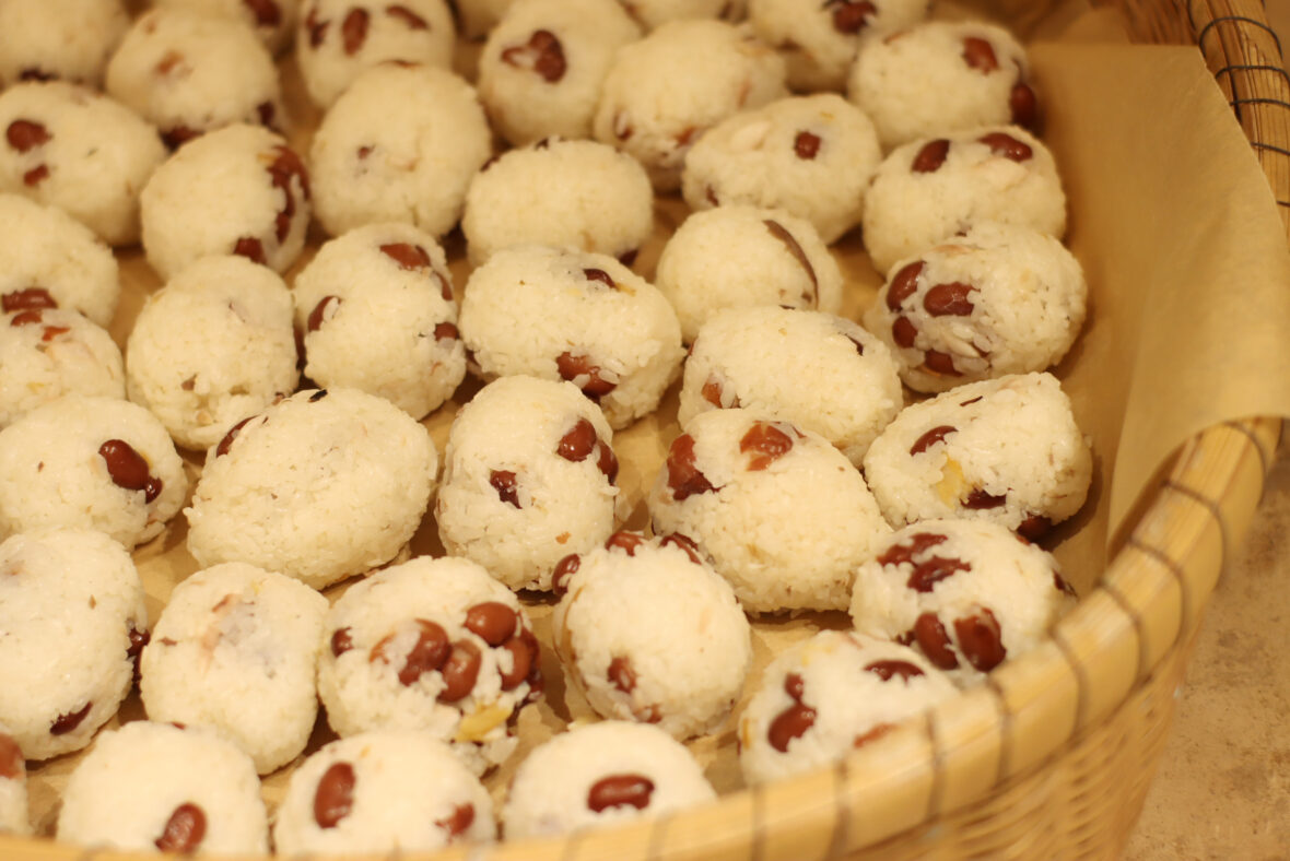 鶏汁のもも肉は、なるべく小さく切るのが特徴です。丁寧に切り揃えたら、ささがき牛蒡と一緒にだし汁でグツグツ煮込みます。同時に、お方ずしの準備も進めなくては! 炊きたてごはんにすし酢を入れて混ぜ、アジと煮豆も加えて、俵型に。大きさをそろえながら丁寧に握り、たくさんのお方ずしが完成しました。