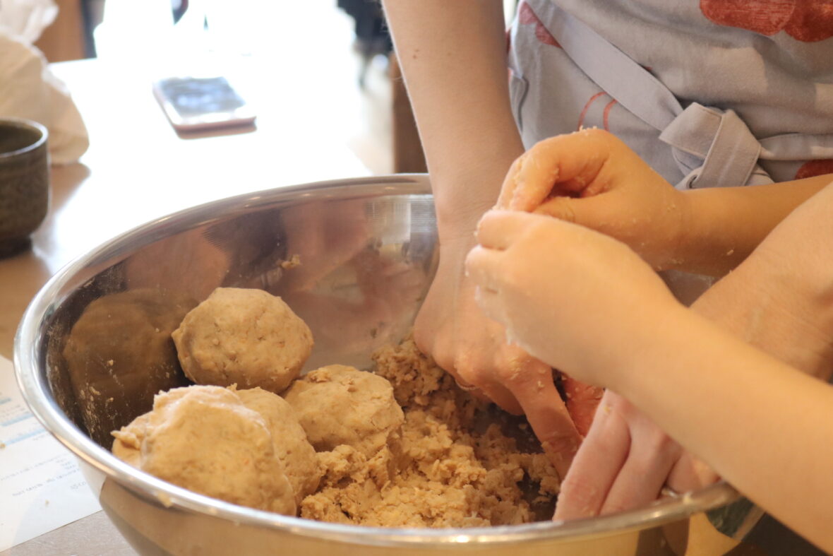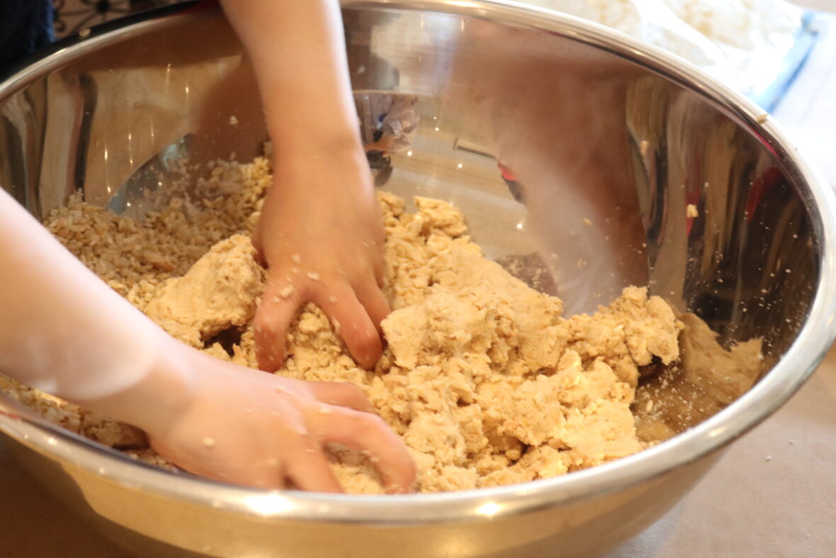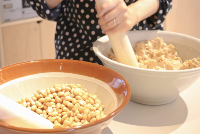 美味しい味噌が仕込める冬。茹でた大豆を潰したり、麹と塩を合わせたり。