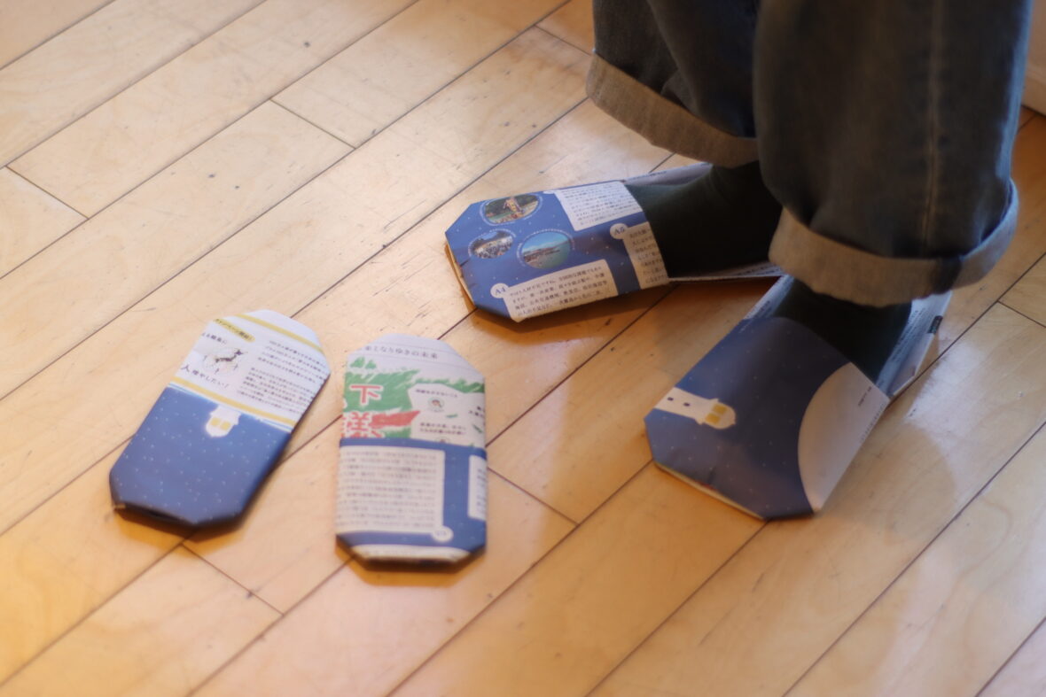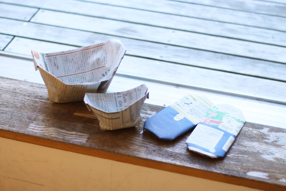 地震や停電のとき、身近な紙が大活躍。新聞紙や包装紙で、コップやスリッパをつくりながら、「もしも」の時に自分ができる工夫を考えます。つくったものは、その場で使ってみよう。