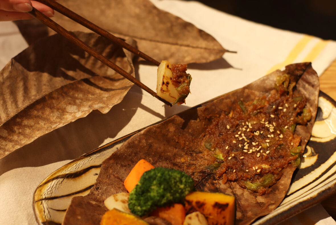 朴(ほお)の木の大きな葉っぱに味噌やネギなどを乗せて焼く朴葉みそで、