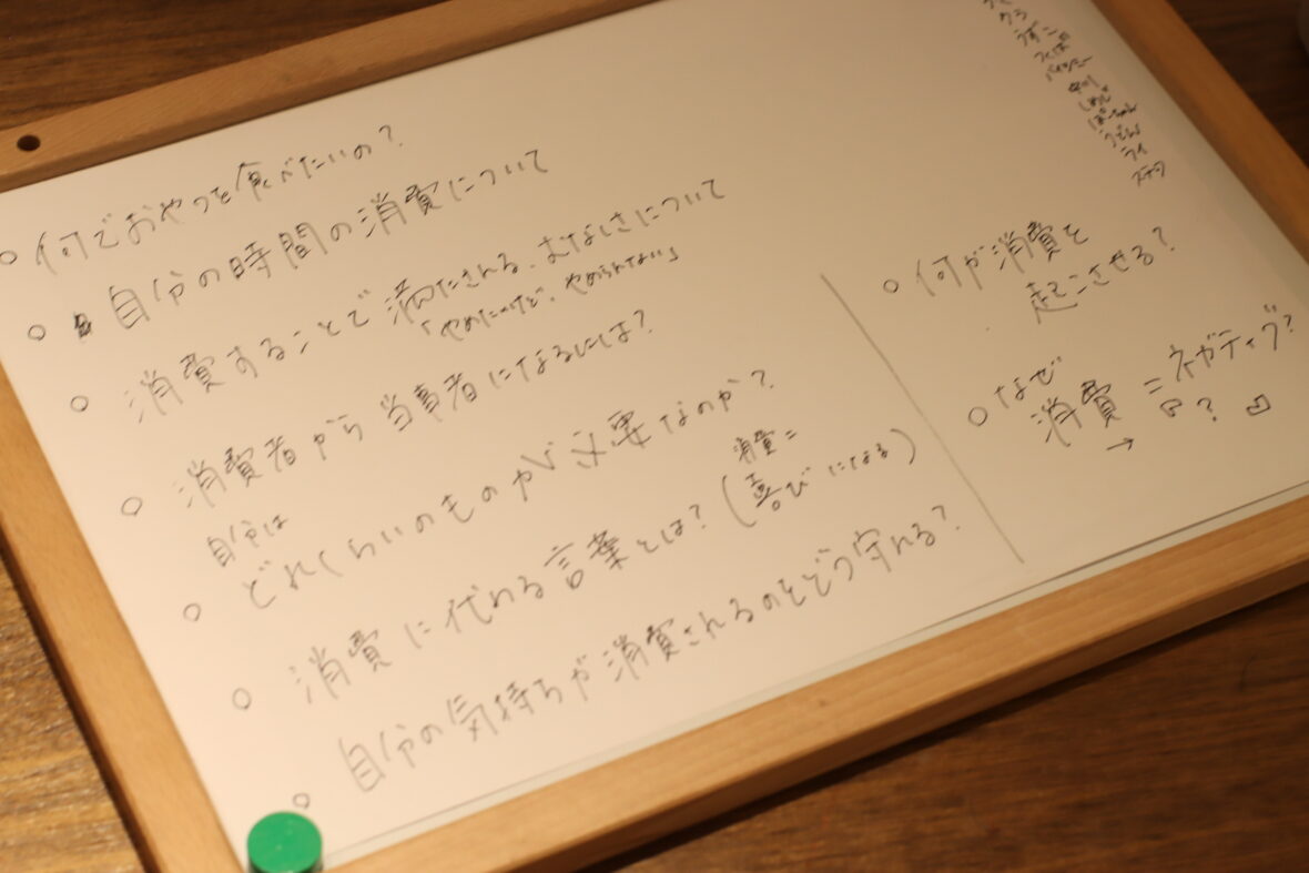 今回は、ただ作って食べるだけではなく、山田さんがお店を営む中で考える「消費」というテーマを持ち寄り、みんなで対話を通して考える時間となりました。