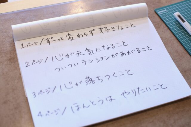 そんなみなさんに、石川さんから助け舟。今日は、ZINE作り入門ということで、制作するページはA4のコピー用紙を4等分し表紙も合わせた表裏8ページ。1ページから4ページまでは何を書くか指定もしていただきました。